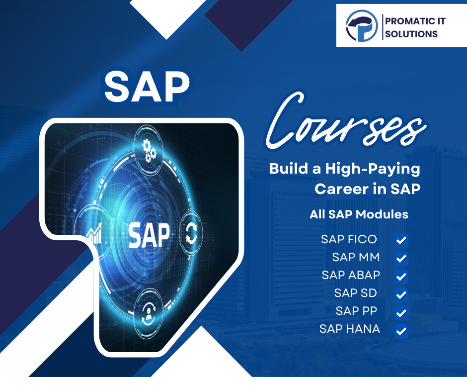At Promatic, we offer comprehensive training in SAP FICO, SAP MM, SAP ABAP, SAP SD, SAP PP, SAP HANA, Data Science, Data Analytics, Java Full Stack, AWS, AI, and ML. Each program includes hands-on practice, live projects, and continuous technical support to ensure in-depth understanding.